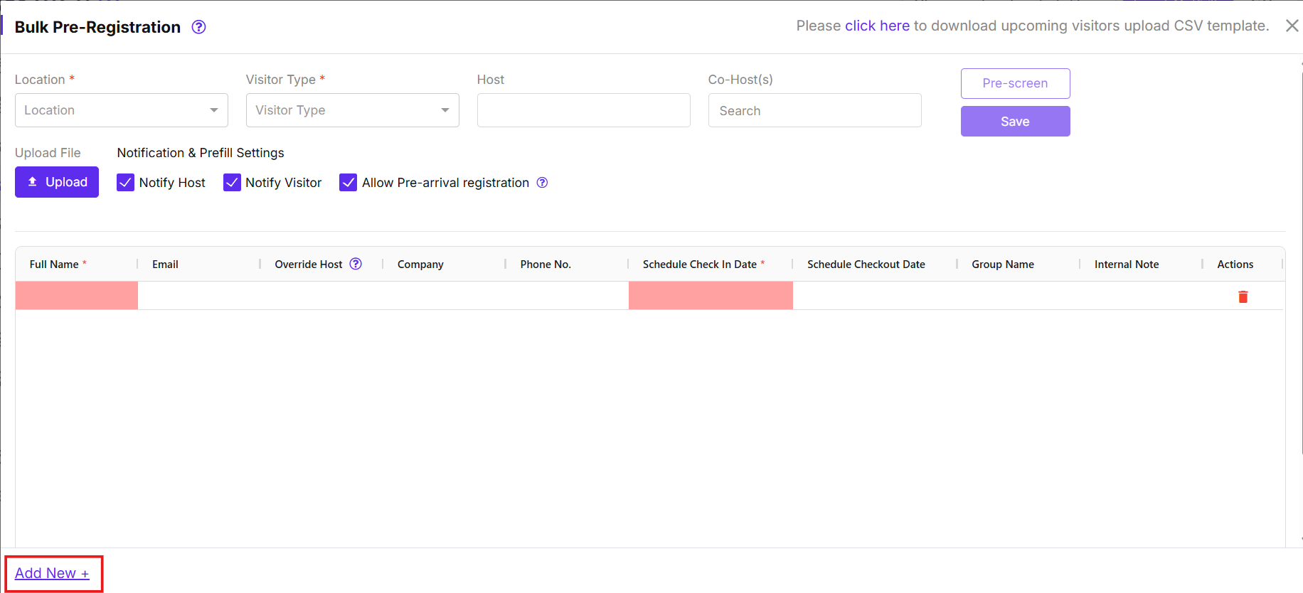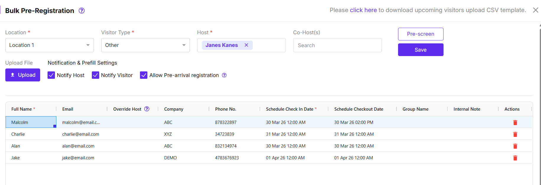Easily pre-register up to 200 visitors at once with Visitly’s Bulk Pre-Registration. Enter details manually or paste them directly from Excel or Google Sheets. The smart grid auto-expands to fit your data, and Excel-style drag-to-fill makes edits quick and easy, perfect for managing large visitor groups with speed and accuracy.