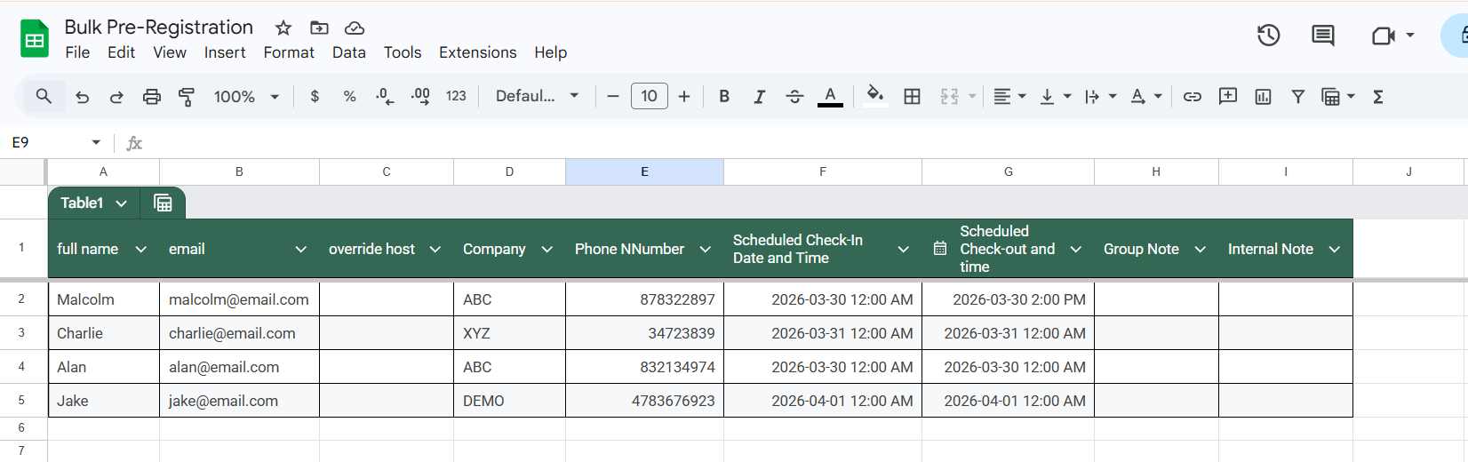 1. In your spreadsheet, arrange visitor details in the following column order:
