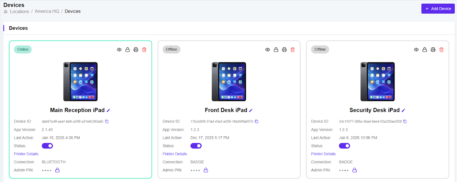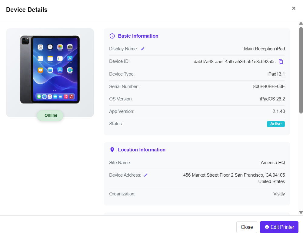 The Devices page in Visitly allows you to view and manage all iPads and kiosks assigned to a specific location. From this page, you can monitor device status, manage printer connections, reset device PINs, and keep device information up to date.
